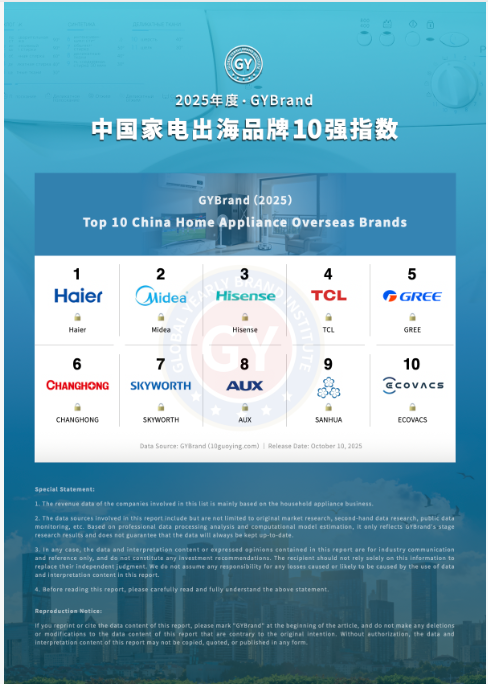 据海尔集团微信公众号10月13日消息,近日,品牌估值与增长咨询公司 GYBrand 全球品牌研究院发布了2025年度中国家电出海品牌10强指数(Top 10 China’s Home Appliance Overseas Brands Index)。